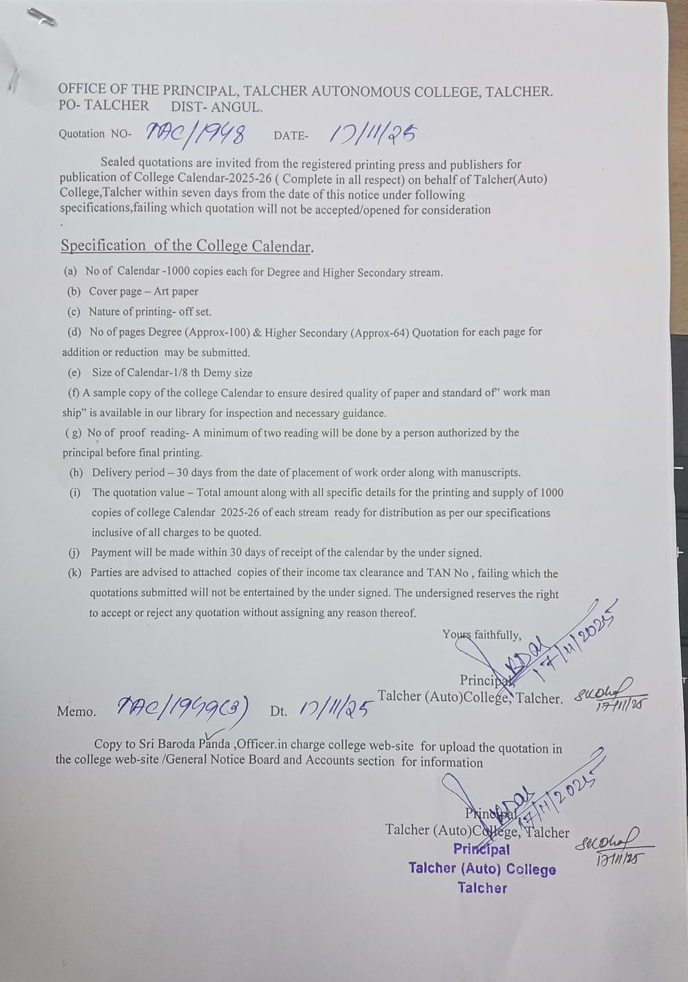 | 4 | Quotation for supply of library card for Talcher Autonomous College | Click here to Download |
